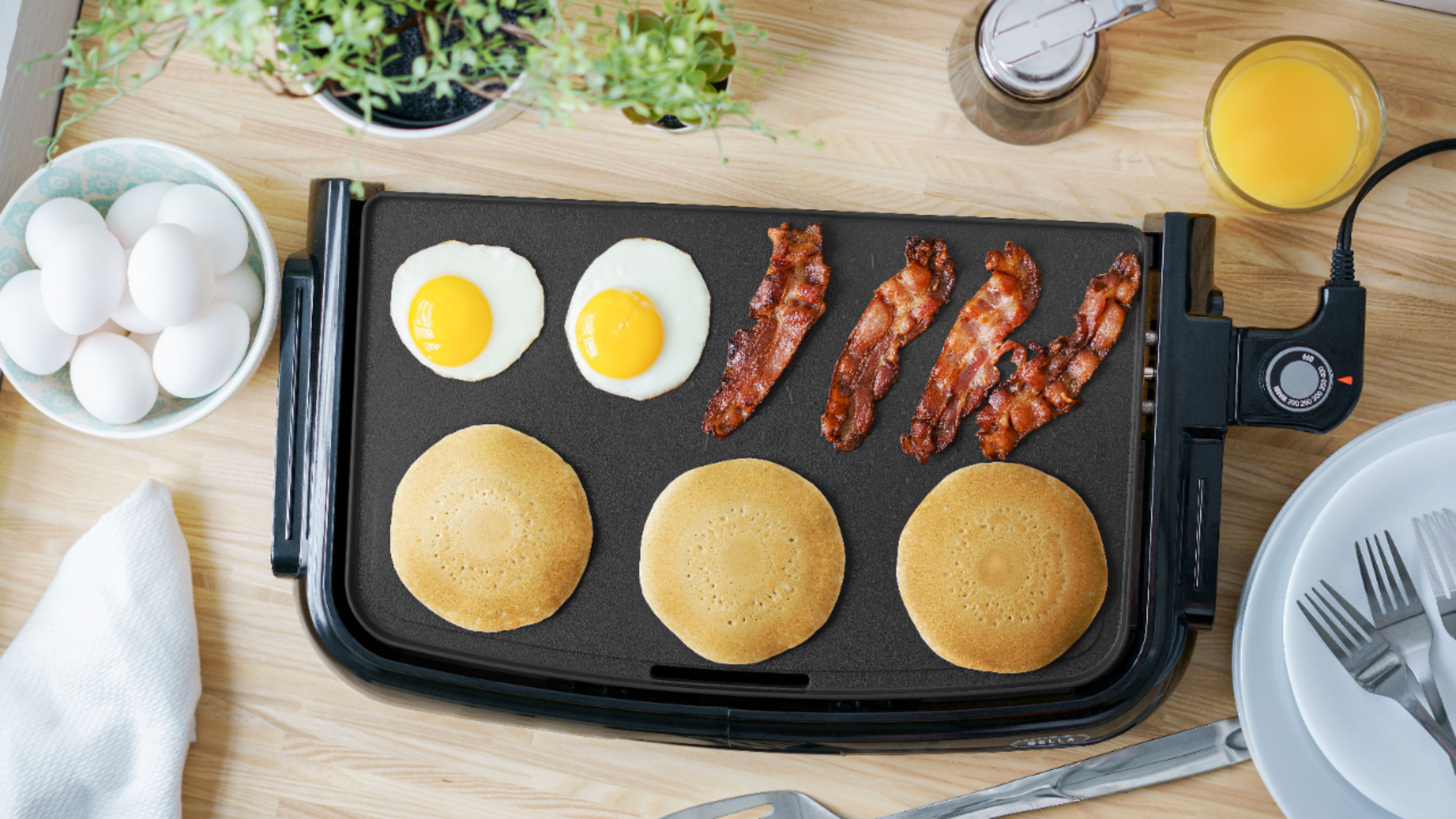 The Bella Nonstick Griddle is convenient and easy to use for a variety of meals. The large 10” x 16” cooking surface makes up to 8 eggs or pancakes at once and can be used for cooking veggies, eggs, pancakes, bacon, French toast, burgers and more. It has a powerful heating system for quick and even cooking with a removable temperature probe for precise temperature control. The nonstick coating makes for easy food release and hassle free clean up, and a convenient cool touch handles and heat proof frame for added safety. This portable electric griddle pulls apart for easy cleaning and storage.
