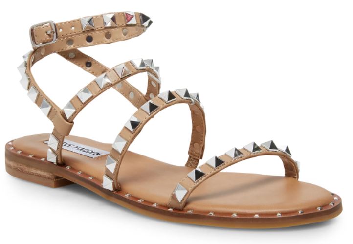 Pyramid studs at metallic moto flash to the gladiator inspired strappy silhouette of Steve Madden’s Travel sandals. Get these in clear or tan.