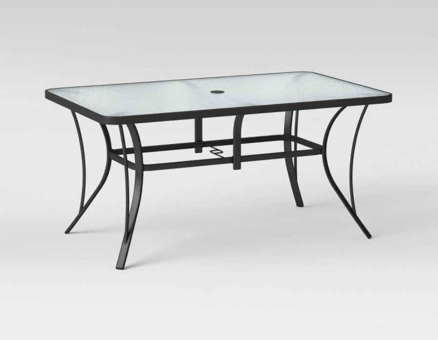 Dine al fresco in the comfort of your own backyard with this Six-Person Glass Rectangular Patio Dining Table in Gray from Room Essentials. With seating capacity for six, everyone is welcome. The thick tempered glass top includes a hole for an umbrella to help shade you while eating and socializing. The nearly one-and-a-half-inch rippled top is smooth to the touch to keep your beverages and dinnerware level. Enhance your patio space with this dining table to accommodate larger groups who wish to dine outdoors without the hassle of rearranging multiple tables together.