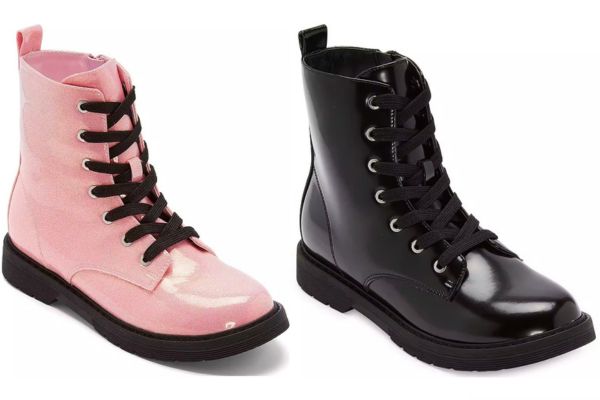 Every step is important, so let her make a statement in Thereabouts Little and Big Girl Combat Boots. These lace-up boots have a glossy patent leather-look profile, minimal silhouette, and closed toe. They also feature a memory foam insole and flatted block heels that provide a little lift and are cushioned for comfort. Wear them with everything from jeans to dresses.