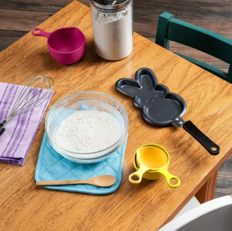 The cutest new brunch addition to your Easter table, this bunny-shaped skillet makes adorable Peeps-shaped pancakes! The set includes Buttermilk pancake mix to make 6 pancakes. Follow the instructions on the package to make the Peep-fect pancake.