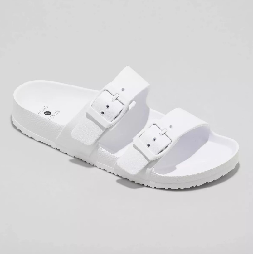 Update your summer wardrobe with the cool and casual look of these comfy Neida EVA Two-Band Slide Sandals from Shade & Shore. These simple yet stylish slip-on sandals feature 100% plastic construction for a squishy feel underfoot and a surface that easily wipes clean. Great for wearing in your garden, on your deck or even to the pool, these open-toe sandals feature a double band on top with two buckles, all in a single color for a chic twist on a classic design.