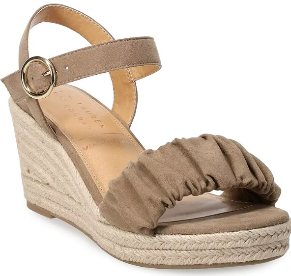 Add a chic warm weather look to your wardrobe with these LC Lauren Conrad Yuki Wedge Sandals. We found these on sale for $16.49 (was $60)! These are available in all sizes in taupe.
